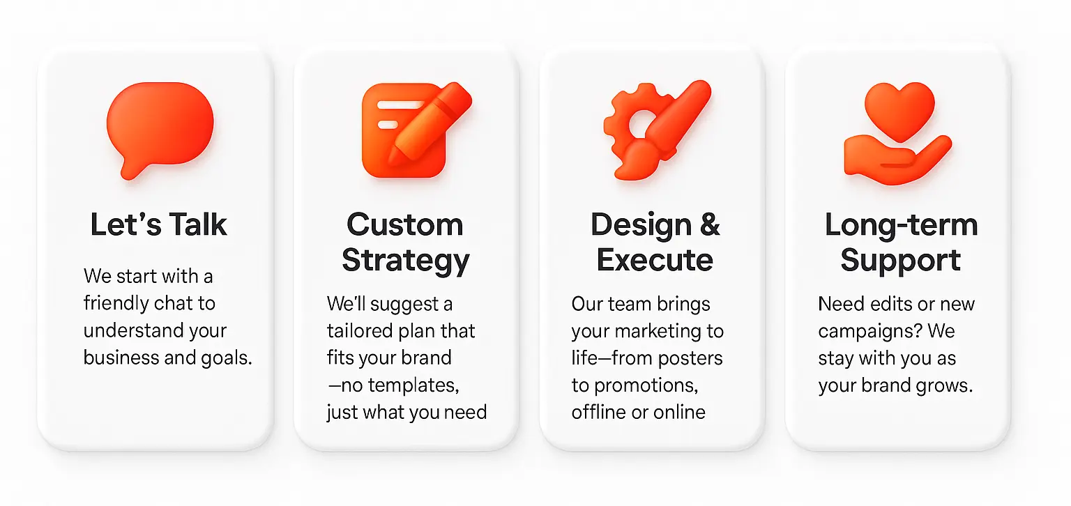 Whether you’re a street-side tea stall with a story to tell, or an emerging brand ready to scale — we offer end-to-end marketing solutions that blend deep strategy with bold creativity. From print to digital, local posters to global campaigns, we believe that great marketing speaks clearly, feels personal, and drives real results.